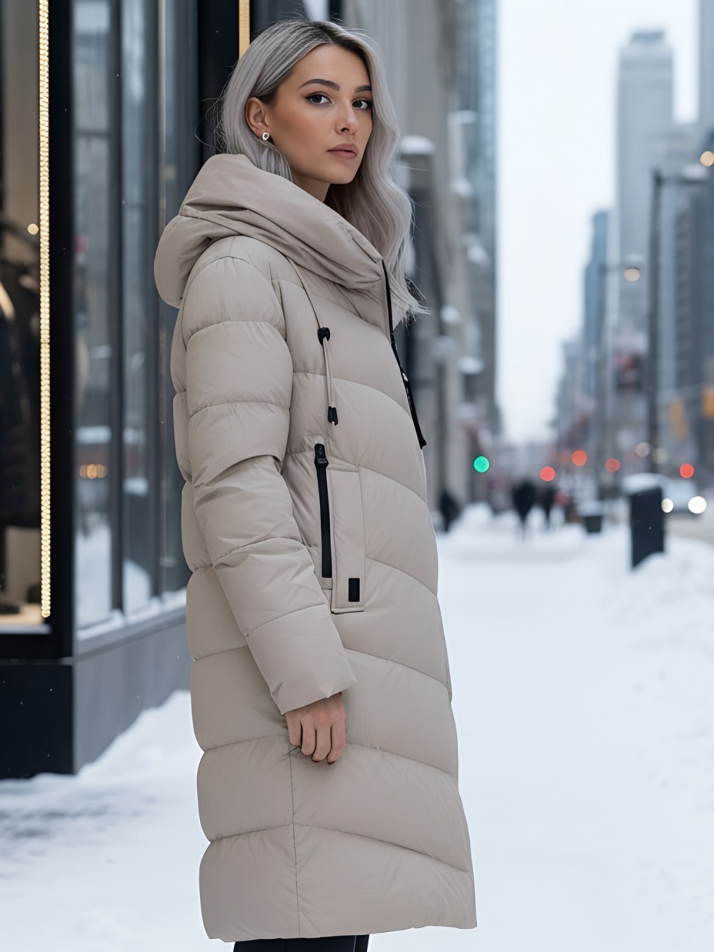 Доступные цвета: черный, хаки, бежевый и темно-коричневый. Пальто-куртка является быстросохнущей, водоотталкивающей и гипоаллергенной, что делает его идеальным выбором для активных женщин. Подходит для осенне-зимнего сезона 2025.