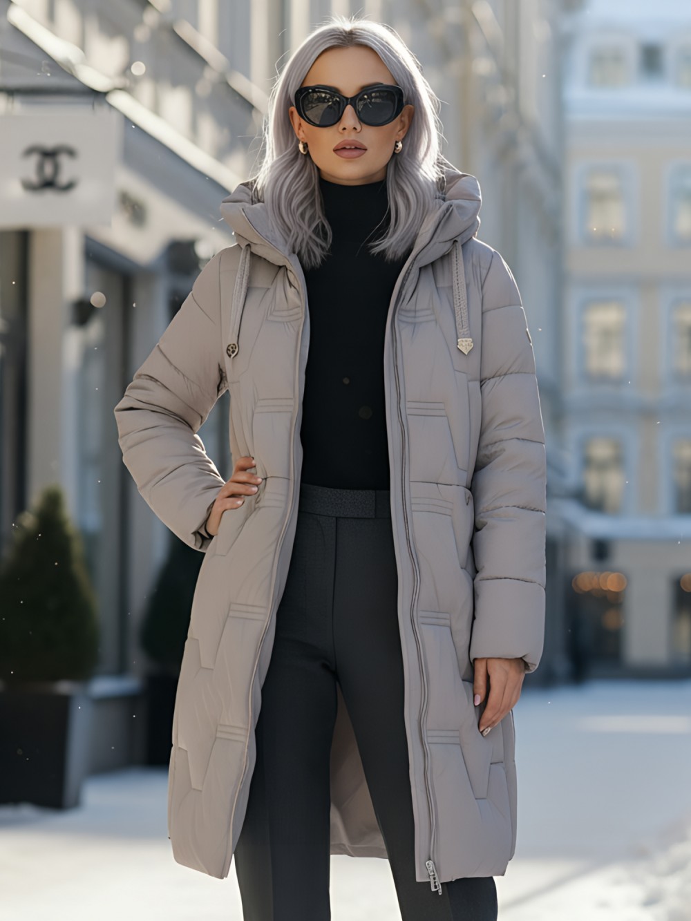 Элегантный капюшон и удлиненная длина до колена создают стильный вид, который подходит как для офисных будней, так и для повседневных выходов. Внутренние карманы, накладные и прорезные карманы на кнопках добавляют практичности, а двойная молния обеспечивает надежную застежку.