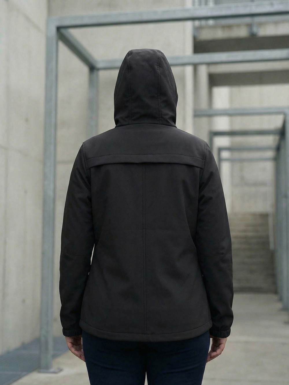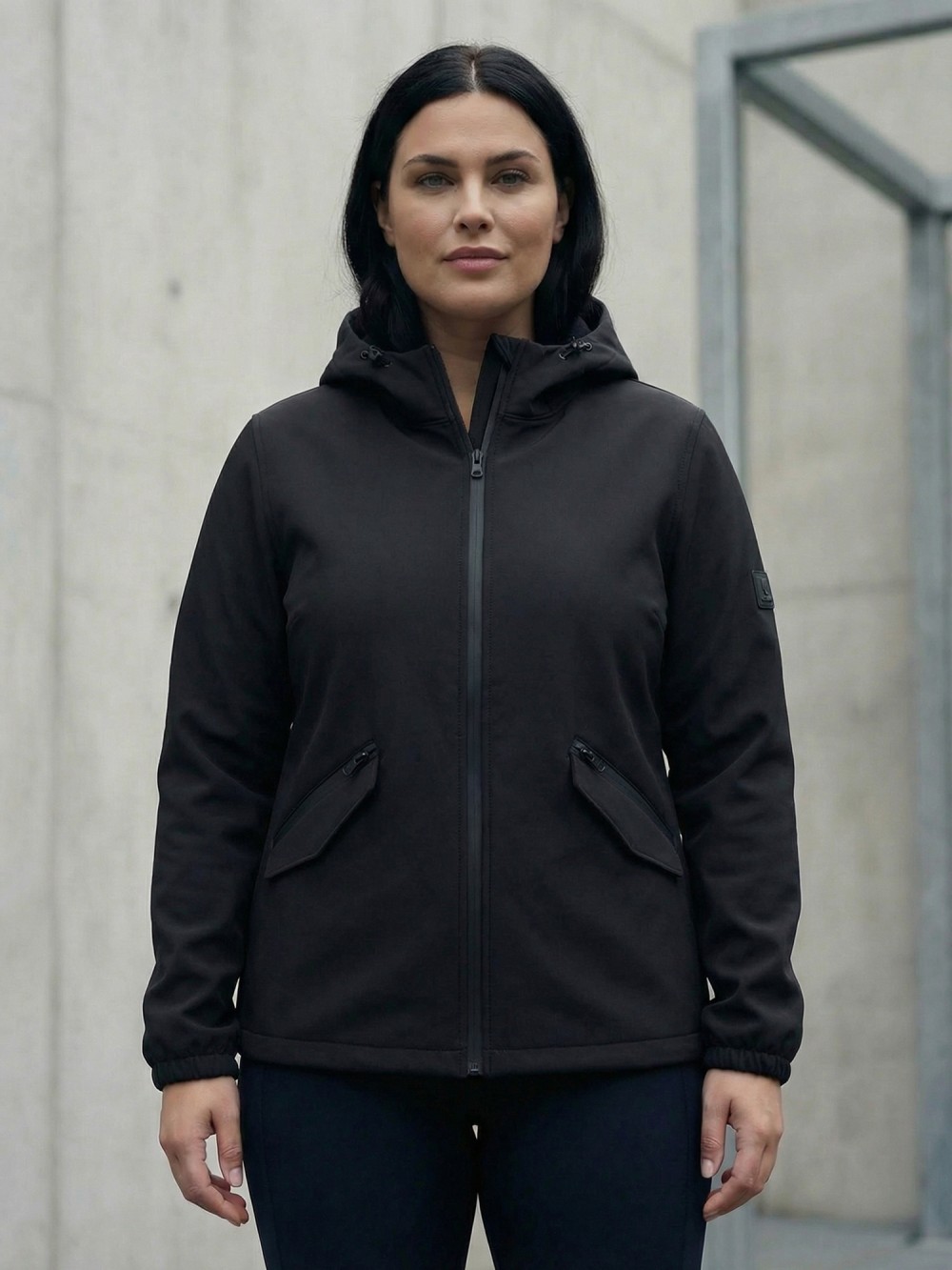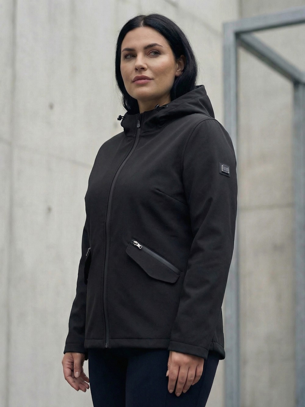 Ветровка женская софтшелл большого размера с капюшоном ветрозащитная черного цвета 9620_1Ch